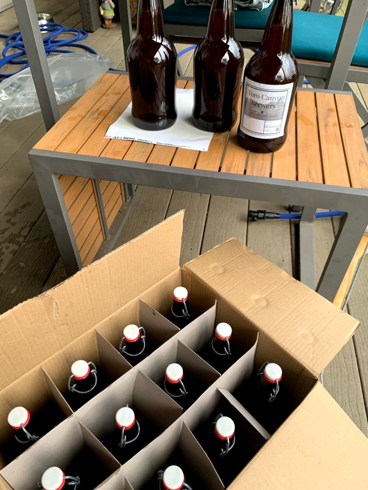 Equipment. When we make beer, we want it to only include “beer”. So, we don’t like metal and use glass containers whenever we can. Glass carabiners are limited in size so we typically brew in small batches. We store our beers in amber glassed 1L reclosable bottles, enough for a few glasses among friends, and we have our customers return the bottles in time for the next brew!